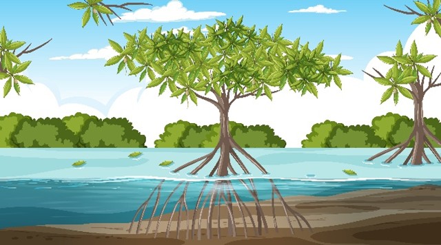 Pelajari interaksi antarorganisme di ekosistem mangrove dan amati perubahan ekosistem jika satu komponen berubah.